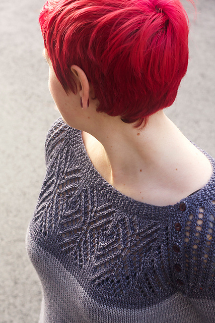 The Snowflake sweater by Tin Can Knits has just a touch of lace to keep it fun. I'd combine Reflection and Silhouette to copy the original pattern's look. (hard copy pattern available here.)