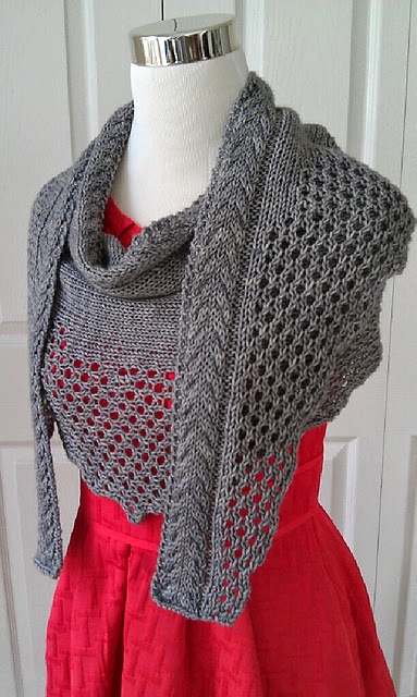 Madeleine (ravname: MadeleineL) knit this beautiful Salad Shawl in Nickel. With cables, stockinette and lace, this shawl has it all!