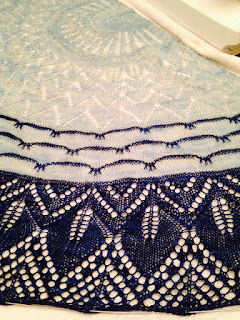 Tracy (ravname: remington) participated in Romi's Mystery Shawl 2015 by Rosemary Hill and once the mystery was revealed she had a beautiful two-colour shawl in Jay Blue in Divine and Cirrus in Entice.