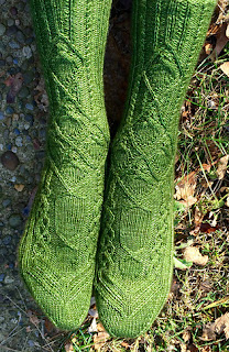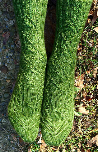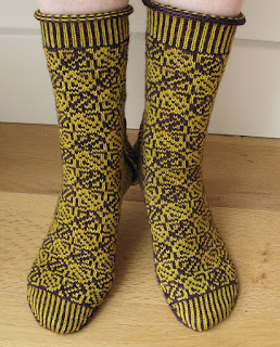 And finally ravname: scj26 knit this awe-inspiring pair of socks in Artisan Sock in Plum Glace and Lichen. scj26 charted and created the pattern on their own and the result, Tessellation, is fantastic. That must have been one heck of a chart.