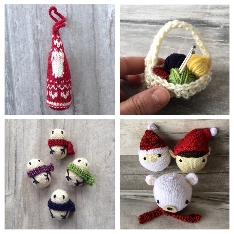 Clockwise from upper left: Scandinavian Santa by Calle del Limon shown in Artisan sock in Red Carpet, Nekkid and Blacklight (with a little non-HK pink for the face); Yarn Basket Ornament by Scarlet Taylor in Cadence in Nekkid and Artisan sock in Witching Hour, Stick o'Butter, Euphorbia and Vamp; Christmas Balls Knit Ornament Pattern Set by Amy Gaines knit in Cadence in Nekkid, Heartthrob, Smolder and Smudge (with a white non-HK acrylic); Mochimochi Snowmen by Anna Hrachovec in Artisan sock in Nekkid, Blacklight, Vamp, Euphorbia, Witching Hour and Violeta.