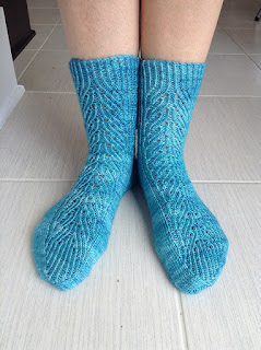 Last time I showed you my first Falls of Rauros sock by Claire Ellen. I finally finished the second one!! These took me quite a while to do. I find twisted ribbing hard on my hands and slow going. But worth it! I think this will make an awesome present for my mother in law. These are in Artisan sock in By the Seashore.